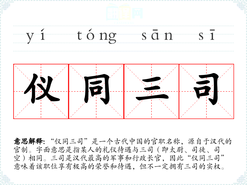 “仪同三司”是一个古代**的官职名称,源自于汉代的官制。字面意思是指某人的礼仪待遇与三司(即太尉、司徒、司空)相同。三司是汉代最高的军事和行政长官,因此“仪同三司”意味着该职位享有极高的荣誉和待遇,但不一定拥有三司的实权。