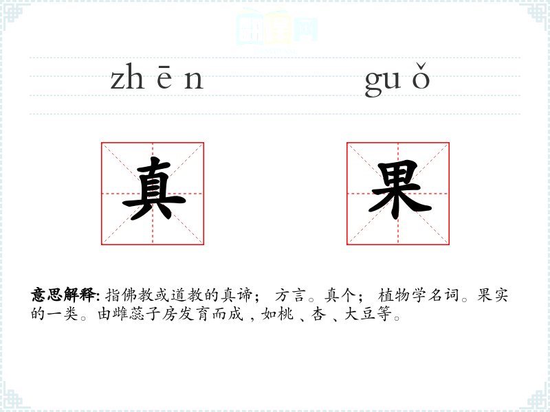 指佛教或道教的真谛; 方言。真个; 植物学名词。果实的一类。由雌蕊子房发育而成﹐如桃﹑杏﹑大豆等。