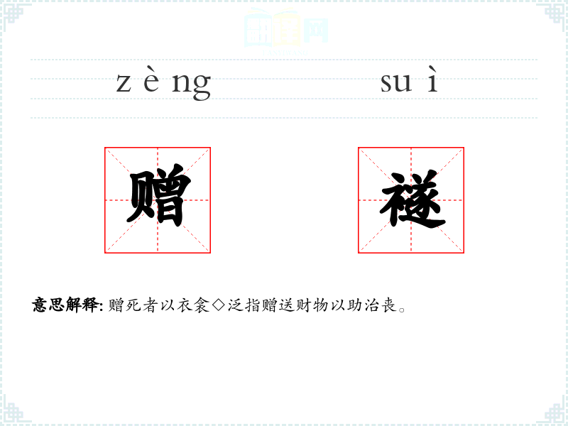赠死者以衣衾◇泛指赠送财物以助治丧。