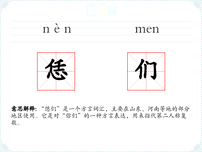 “恁们”是一个方言词汇,主要在山东、河南等地的部分地区使用。它是对“你们”的一种方言表达,用来指代第二人称复数。