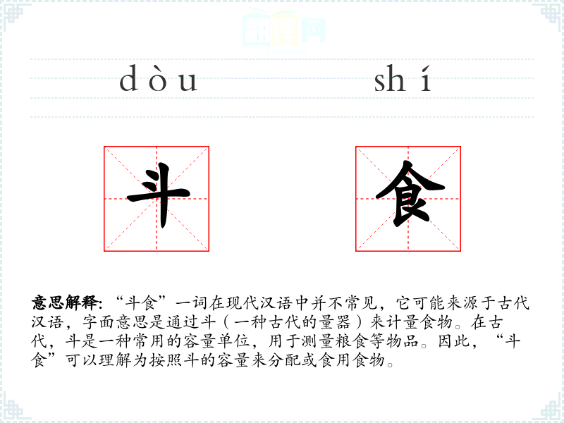 “斗食”一词在现代汉语中并不常见,它可能来源于古代汉语,字面意思是通过斗(一种古代的量器)来计量食物。在古代,斗是一种常用的容量单位,用于测量粮食等物品。因此,“斗食”可以理解为按照斗的容量来分配或食用食物。