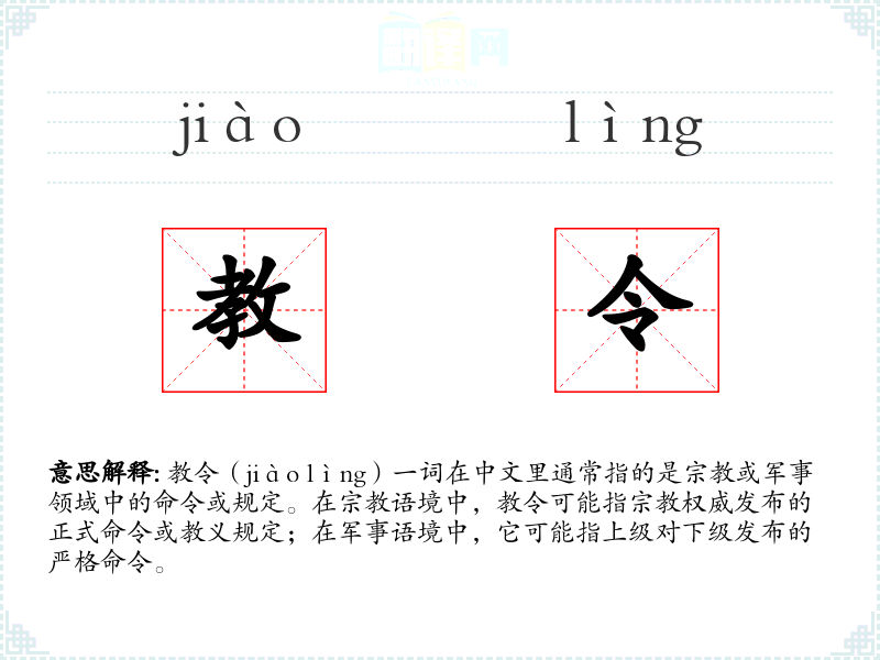 教令(jiào lìng)一词在中文里通常指的是或军事领域中的命令或规定。在语境中,教令可能指**权威发布的正式命令或教义规定;在军事语境中,它可能指上级对下级发布的严格命令。