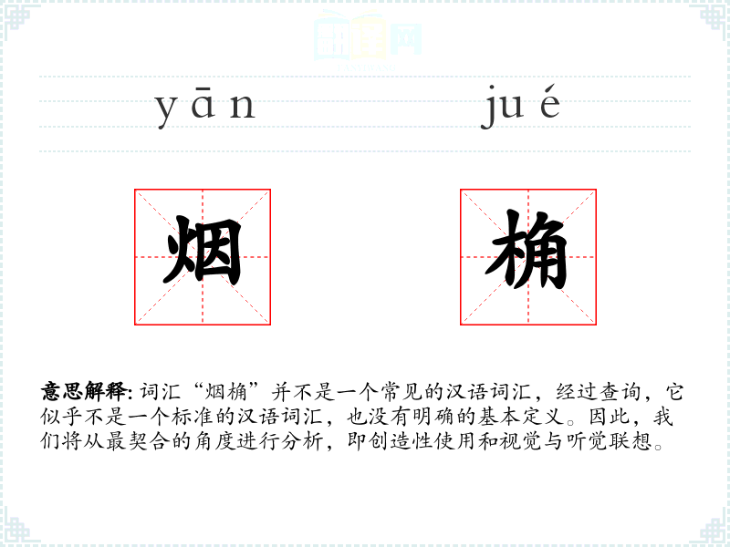 总之,虽然“烟桷”不是一个常见的词汇,但通过上述的分析和创造性使用,我们可以看到即使在面对不熟悉的词汇时,我们仍然可以通过联想和创造来探索其潜在的意义和美感。