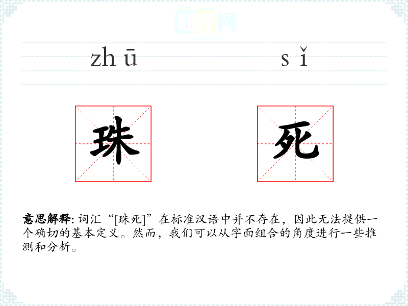 词汇“[珠死]”在标准汉语中并不存在,因此无法提供一个确切的基本定义。然而,我们可以从字面组合的角度进行一些推测和分析。