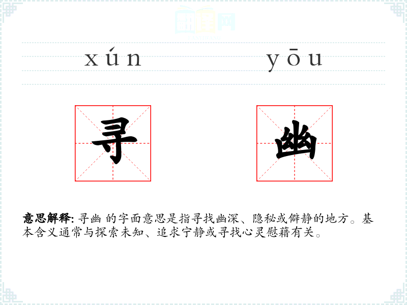 寻幽 的字面意思是指寻找幽深、隐秘或僻静的地方。基本含义通常与探索未知、追求宁静或寻找心灵慰藉有关。