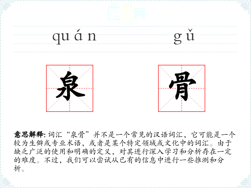 由于“泉骨”不是一个常见的词汇,对其进行深入学习和分析存在一定的难度。如果它在某个特定的语境中出现,可能需要结合具体的上下文来理解其含义和应用。在语言学习和表达中,理解和掌握词汇的准确含义和用法是非常重要的,但对于生僻或专业术语,可能需要更多的专业知识和背景信息。