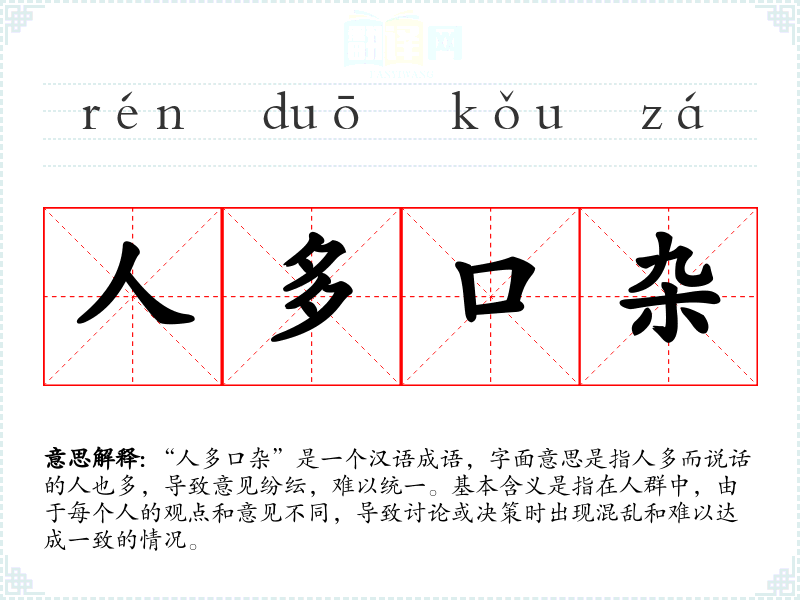 “人多口杂”是一个汉语成语,字面意思是指人多而说话的人也多,导致意见纷纭,难以统一。基本含义是指在人群中,由于每个人的观点和意见不同,导致讨论或决策时出现混乱和难以达成一致的情况。