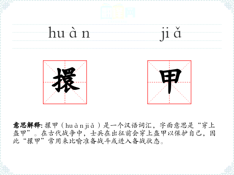 擐甲(huàn jiǎ)是一个汉语词汇,字面意思是“穿上盔甲”。在古代战争中,士兵在出征前会穿上盔甲以保护自己,因此“擐甲”常用来比喻准备战斗或进入备战状态。