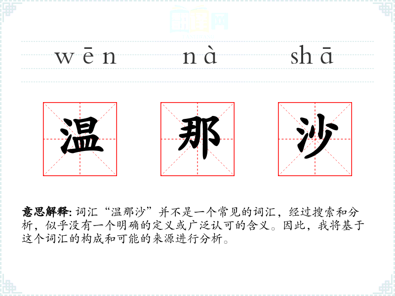 词汇“温那沙”并不是一个常见的词汇,经过搜索和分析,似乎没有一个明确的定义或广泛认可的含义。因此,我将基于这个词汇的构成和可能的来源进行分析。