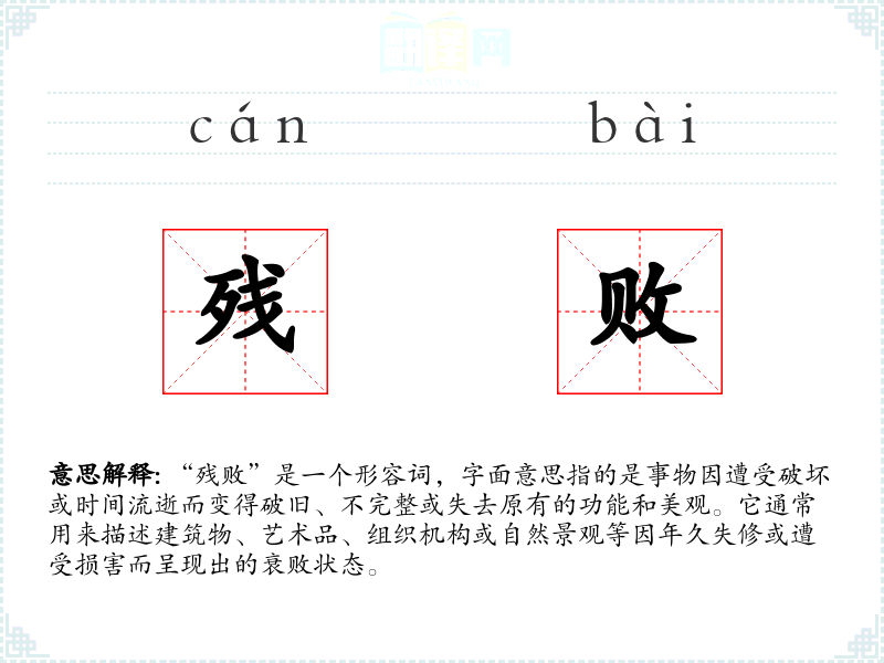 “残败”由“残”和“败”两个字组成。“残”字古汉语中意为剩余、不完整,“败”字则有失败、破坏之意。两者结合,形成了描述事物不完整且遭受破坏的状态。