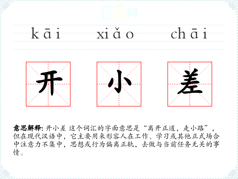 - 专业领域:在教育或企业管理中,开小差可能指学生或员工在工作学*时的不专注行为。