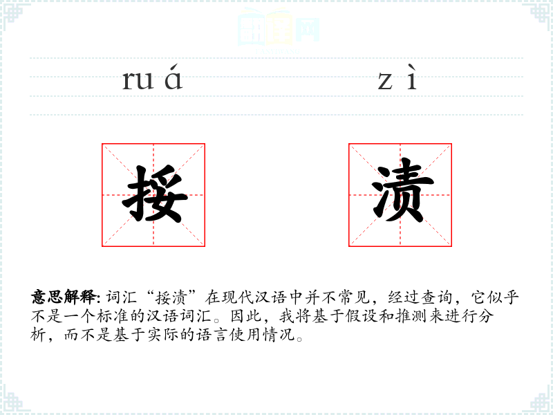 由于“挼渍”不是一个标准词汇,我们无法给出确切的字面意思和基本含义。如果假设它是由两个汉字组成的词汇,“挼”可能与揉搓、摩擦有关,而“渍”通常指液体留下的痕迹或污渍。结合这两个字,我们可以推测“挼渍”可能指的是通过揉搓或摩擦产生的污渍。