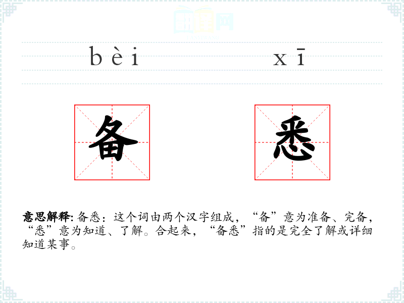 备悉:这个词由两个汉字组成,“备”意为准备、完备,“悉”意为知道、了解。合起来,“备悉”指的是完全了解或详细知道某事。