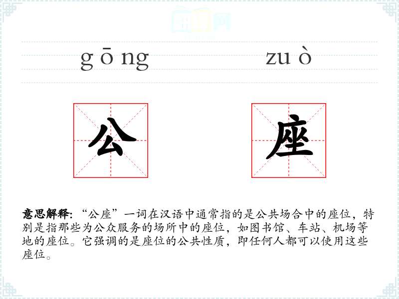 “公座”一词在汉语中通常指的是公共场合中的座位,特别是指那些为公众服务的场所中的座位,如图书馆、车站、机场等地的座位。它强调的是座位的公共性质,即任何人都可以使用这些座位。