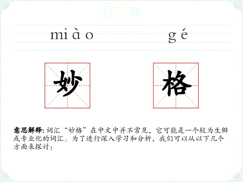 词汇“妙格”在中文中并不常见,它可能是一个较为生僻或专业化的词汇。为了进行深入学*和分析,我们可以从以下几个方面来探讨: