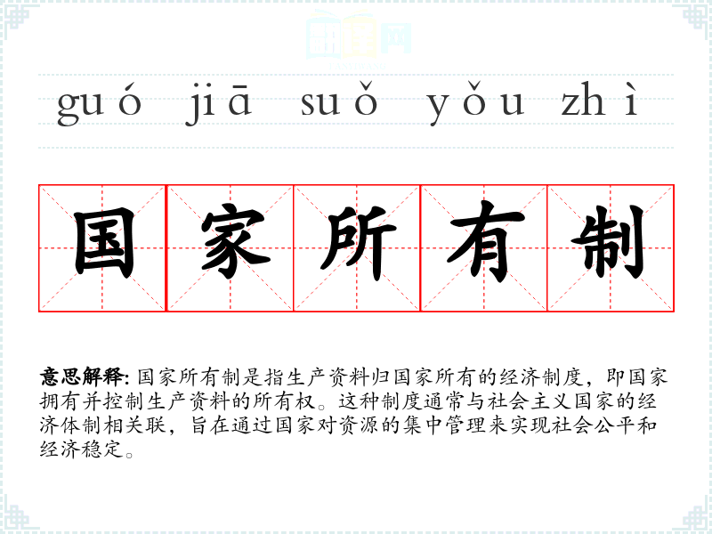 国家所有制是指生产资料归国家所有的经济制度,即国家拥有并控制生产资料的所有权。这种制度通常与社会主义国家的经济体制相关联,旨在通过国家对资源的集中管理来实现社会公平和经济稳定。