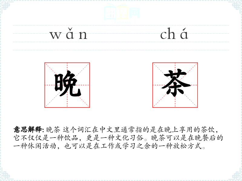 同义词:夜茶、晚间茶饮 反义词:早茶、晨茶