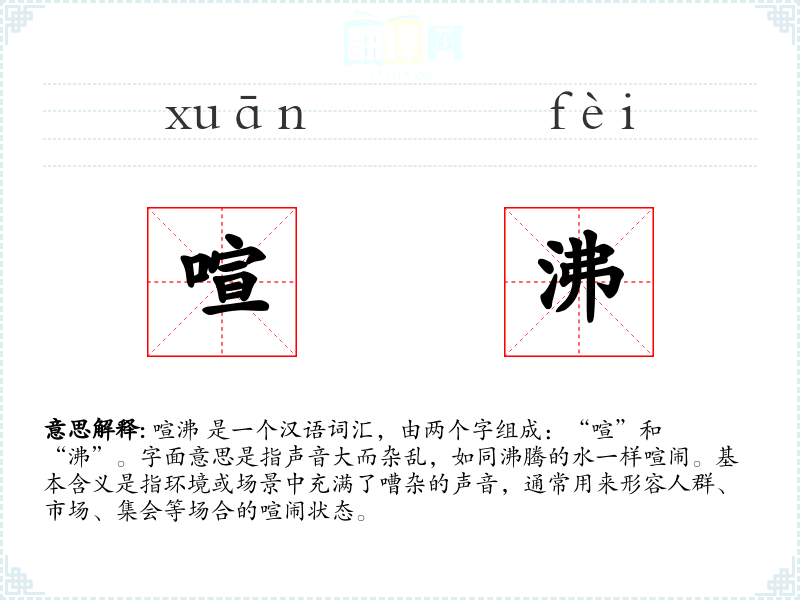 喧沸 是一个汉语词汇,由两个字组成:“喧”和“沸”。字面意思是指声音大而杂乱,如同沸腾的水一样喧闹。基本含义是指环境或场景中充满了嘈杂的声音,通常用来形容人群、市场、**等场合的喧闹状态。