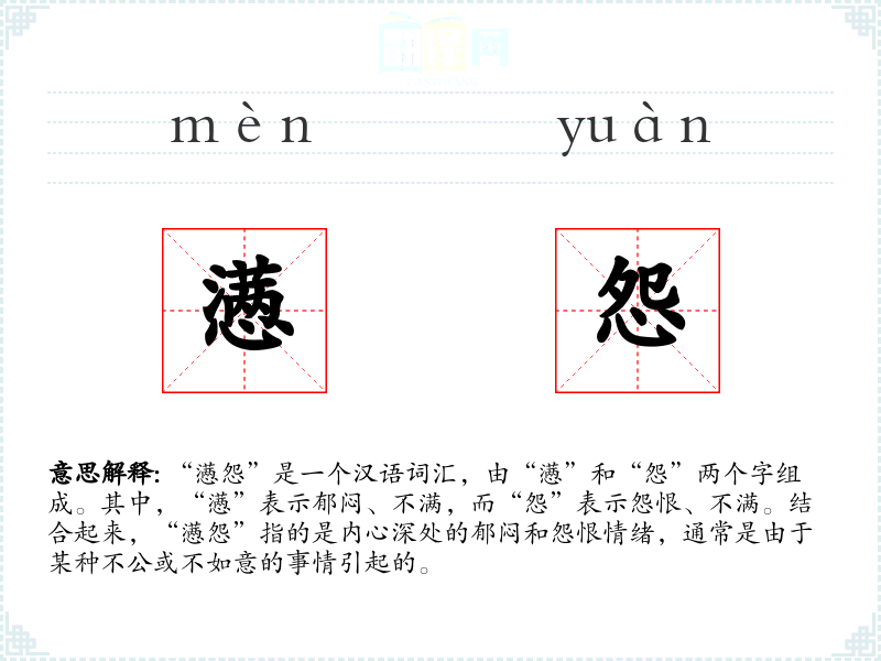 在英语中,“懑怨”可以对应为“resentment”或“grudge”,这两个词都表示对某事或某人的不满和怨恨。然而,“懑怨”这个词在中文中更强调内心的郁闷和压抑,而“resentment”和“grudge”则更侧重于外在的怨恨和不满。