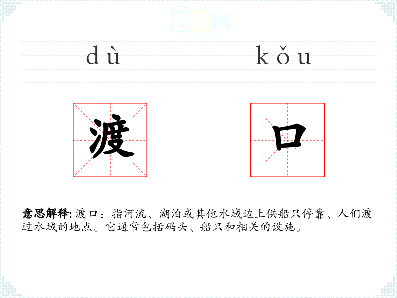 同义词:码头、渡船站、渡桥 反义词:陆地、岸边(相对于渡口的水域)