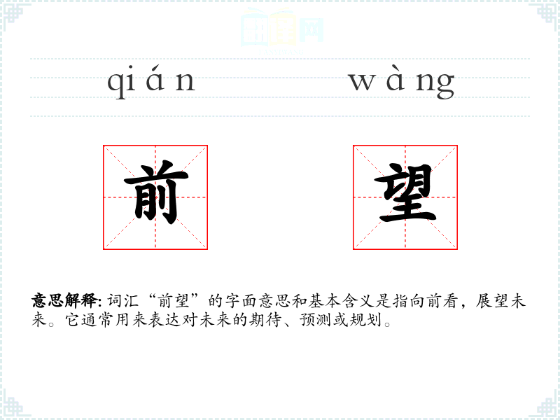词汇“前望”的字面意思和基本含义是指向前看,展望未来。它通常用来表达对未来的期待、预测或规划。