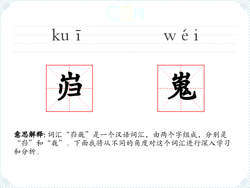 词汇“岿巍”是一个汉语词汇,由两个字组成,分别是“岿”和“巍”。下面我将从不同的角度对这个词汇进行深入学*和分析。