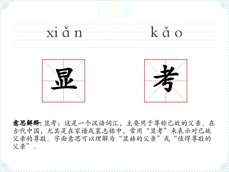 - 在古代文献中,常可见到“显考”一词,用以尊称已故的父亲。