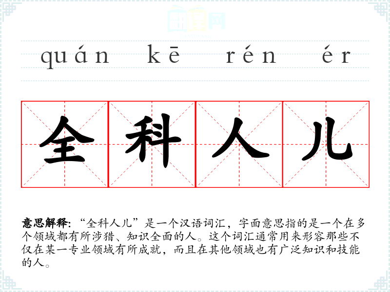 “全科人儿”是一个汉语词汇,字面意思指的是一个在多个领域都有所涉猎、知识全面的人。这个词汇通常用来形容那些不仅在某一专业领域有所成就,而且在其他领域也有广泛知识和技能的人。
