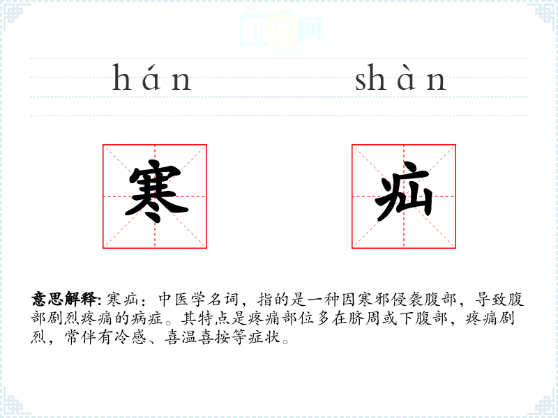 词源:寒疝一词源自中医学,由“寒”和“疝”两个字组成。“寒”指寒冷,“疝”指腹部疼痛。 演变:随着中医学的发展,寒疝的诊断和治疗方法也在不断完善。