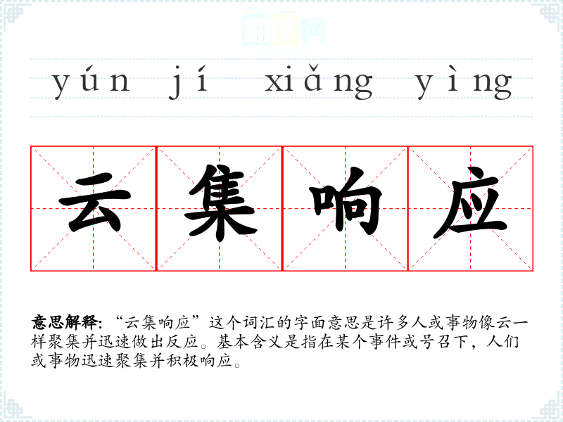 “云集响应”这个词汇的字面意思是许多人或事物像云一样聚集并迅速做出反应。基本含义是指在某个**或号召下,人们或事物迅速聚集并积极响应。