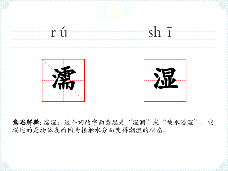 濡湿:这个词的字面意思是“湿润”或“被水浸湿”。它描述的是物体表面因为接触水分而变得潮湿的状态。