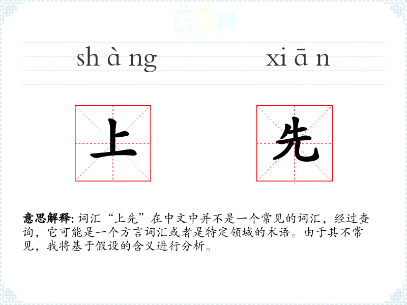 词汇“上先”在中文中并不是一个常见的词汇,经过查询,它可能是一个方言词汇或者是特定领域的术语。由于其不常见,我将基于假设的含义进行分析。