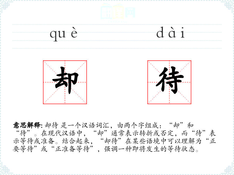 “却待”是一个富有文学色彩的词汇,虽然在日常口语中不常见,但在特定的语境和文体中,它能有效地传达一种即将等待的状态和情感。在学*汉语时,了解和掌握这样的词汇有助于丰富语言表达的层次和深度。