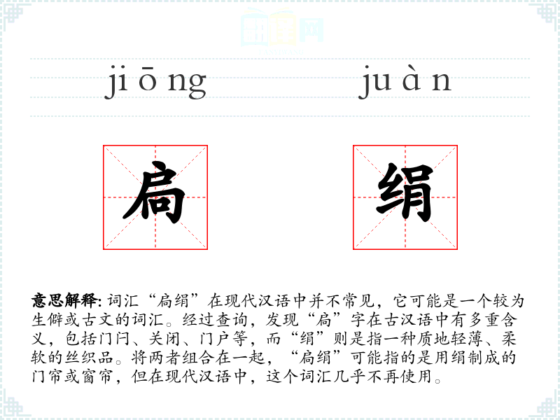 由于“扃绢”在现代汉语中不常用,它可能出现在古文、历史文献或特定的文学作品中,用以描述古代的室内装饰或生活场景。