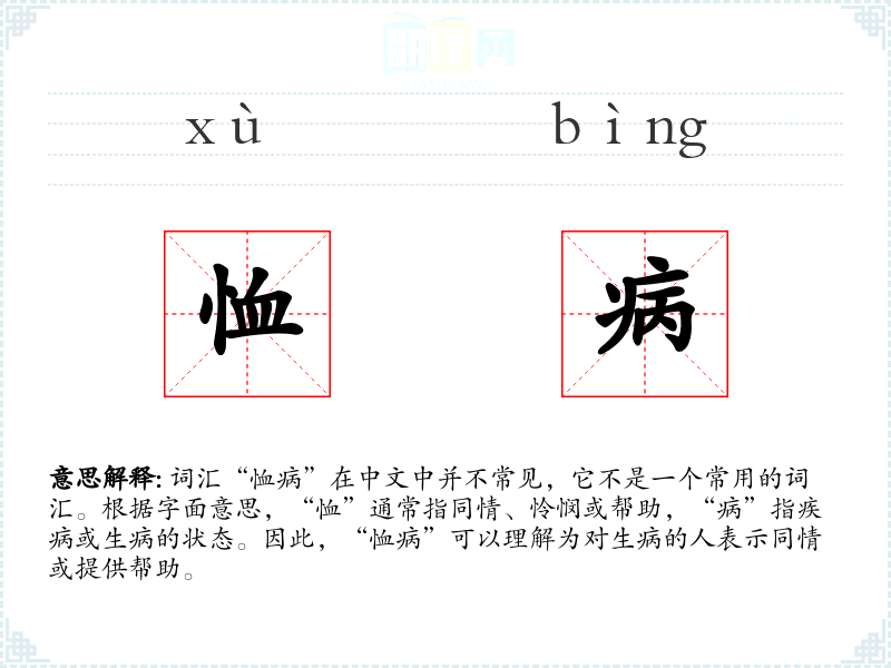 “恤病”这个词虽然不常用,但它体现了对病人的关怀和支持,符合*文化中对生病人的关心和照顾的传统美德。在语言学和表达中,了解和使用这样的词汇可以丰富我们的表达方式,传达更深层次的情感和关怀。