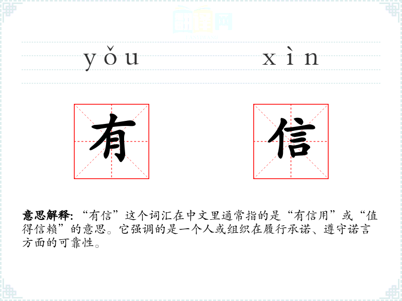“有信”这个词汇在中文里通常指的是“有信用”或“值得信赖”的意思。它强调的是一个人或组织在履行承诺、遵守诺言方面的可靠性。