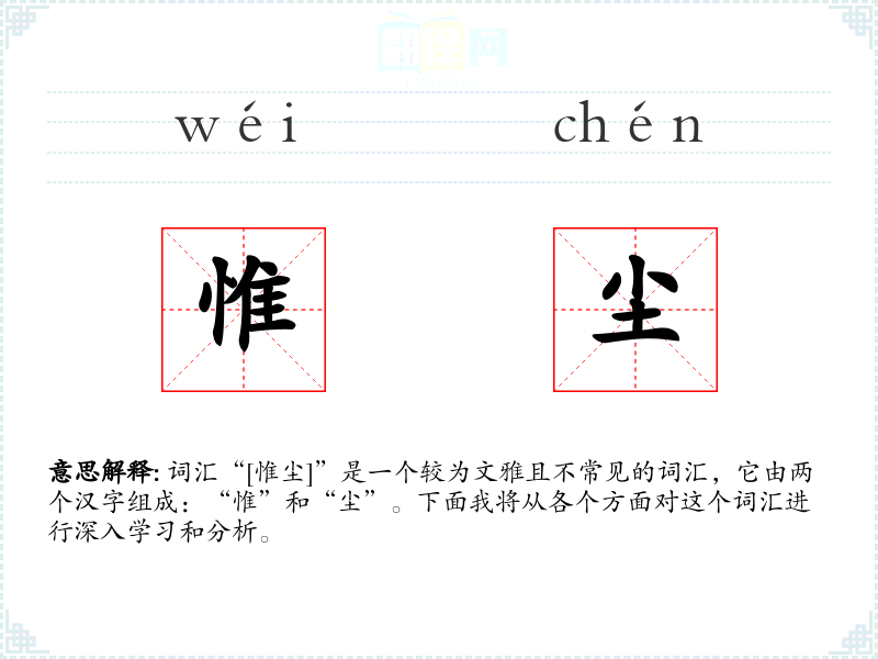 词汇“[惟尘]”是一个较为文雅且不常见的词汇,它由两个汉字组成:“惟”和“尘”。下面我将从各个方面对这个词汇进行深入学*和分析。