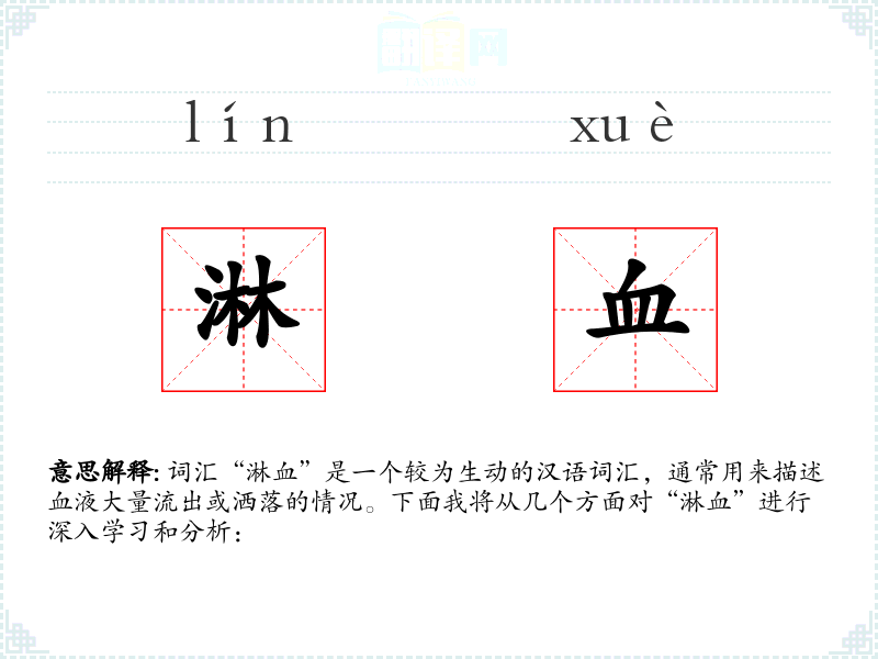 词汇“淋血”是一个较为生动的汉语词汇,通常用来描述血液大量流出或洒落的情况。下面我将从几个方面对“淋血”进行深入学*和分析: