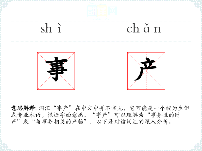 词汇“事产”在中文中并不常见,它可能是一个较为生僻或专业术语。根据字面意思,“事产”可以理解为“事务性的财产”或“与事务相关的产物”。以下是对该词汇的深入分析: