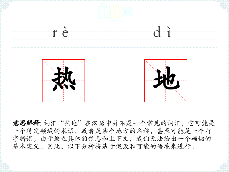 词汇“热地”在汉语中并不是一个常见的词汇,它可能是一个特定领域的术语,或者是某个地方的名称,甚至可能是一个打字错误。由于缺乏具体的信息和上下文,我们无法给出一个确切的基本定义。因此,以下分析将基于假设和可能的语境来进行。