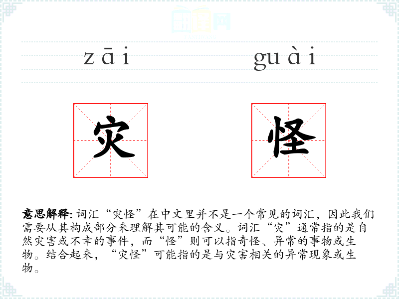- 反义词:吉祥物、瑞兽(这些词通常与好运和吉祥相关,与“灾怪”形成对比)