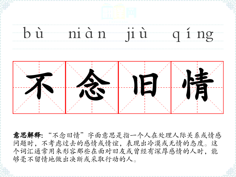 “不念旧情”字面意思是指一个人在处理人际关系或情感问题时,不考虑过去的感情或情谊,表现出冷漠或无情的态度。这个词汇通常用来形容那些在面对旧友或曾经有深厚感情的人时,能够毫不留情地做出决断或采取行动的人。