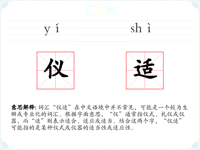 - 字面意思:仪适可能指的是仪式或仪器的适当性或适应性。