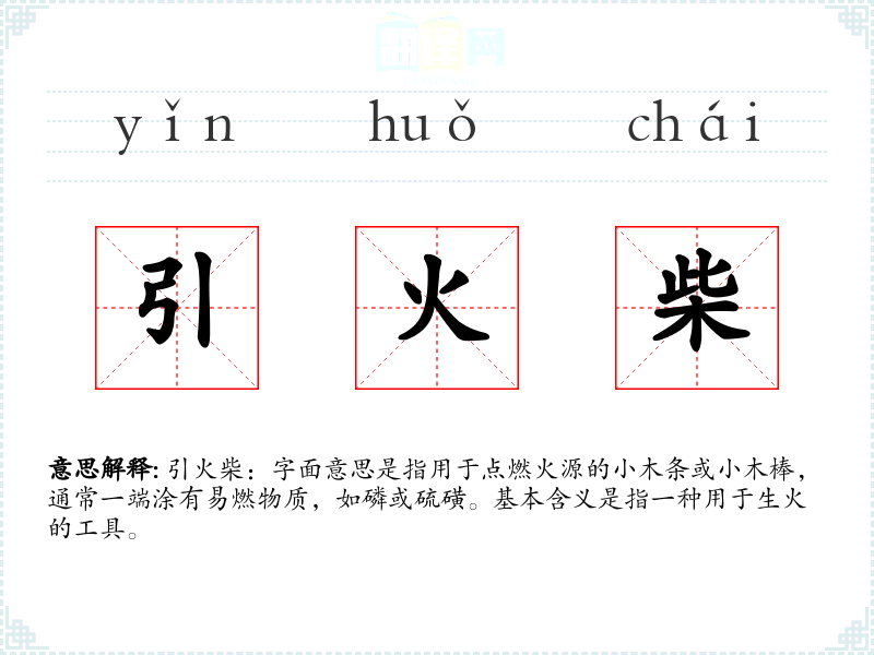 引火柴:字面意思是指用于点燃火源的小木条或小木棒,通常一端涂有易燃物质,如磷或硫磺。基本含义是指一种用于生火的工具。