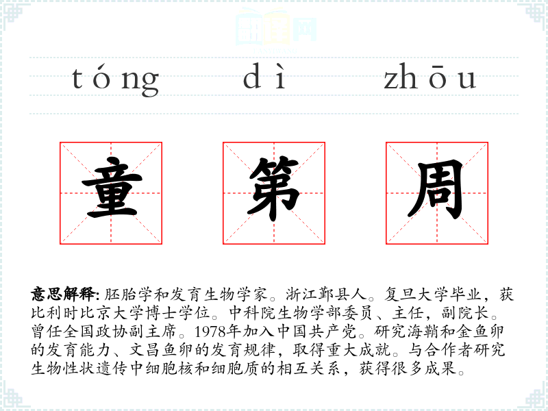 1.胚胎学和发育生物学家。浙江鄞县人。复旦大学毕业,获比利时比京大学博士学位。中科院生物学部委员、主任,副院长。曾任全国政协副主席。1978年加入中国共产党。研究海鞘和金鱼卵的发育能力、文昌鱼卵的发育规律,取得重大成就。与合作者研究生物性状遗传中细胞核和细胞质的相互关系,获得很多成果。