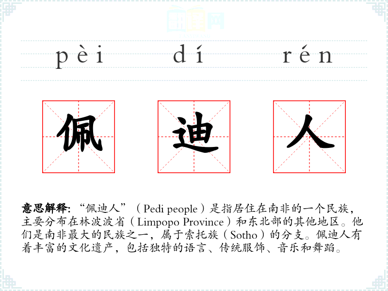 - 同义词:索托人(Sotho people),因为佩迪人是索托族的一部分。