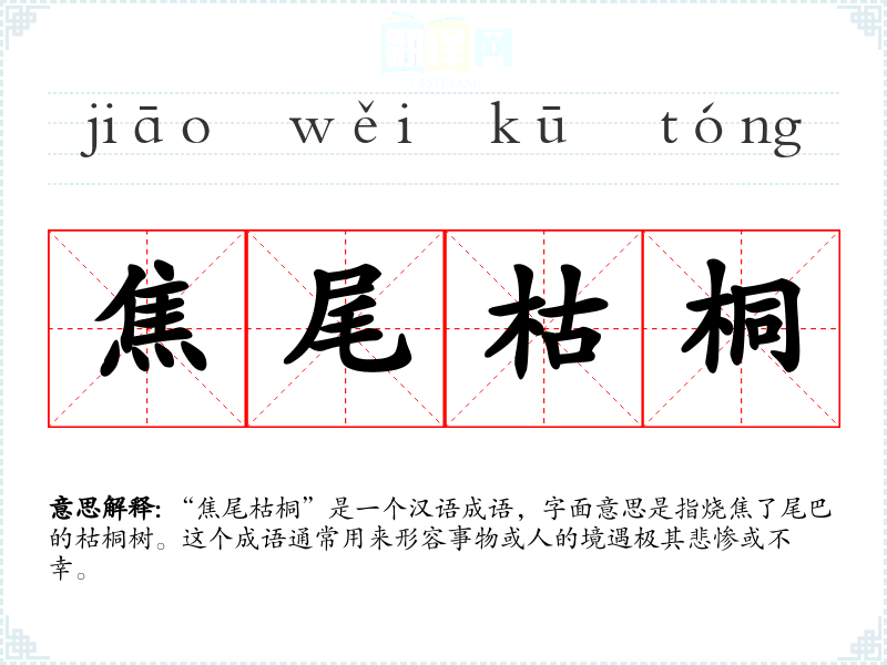“焦尾枯桐”是一个汉语成语,字面意思是指烧焦了尾巴的枯桐树。这个成语通常用来形容事物或人的境遇极其悲惨或不幸。