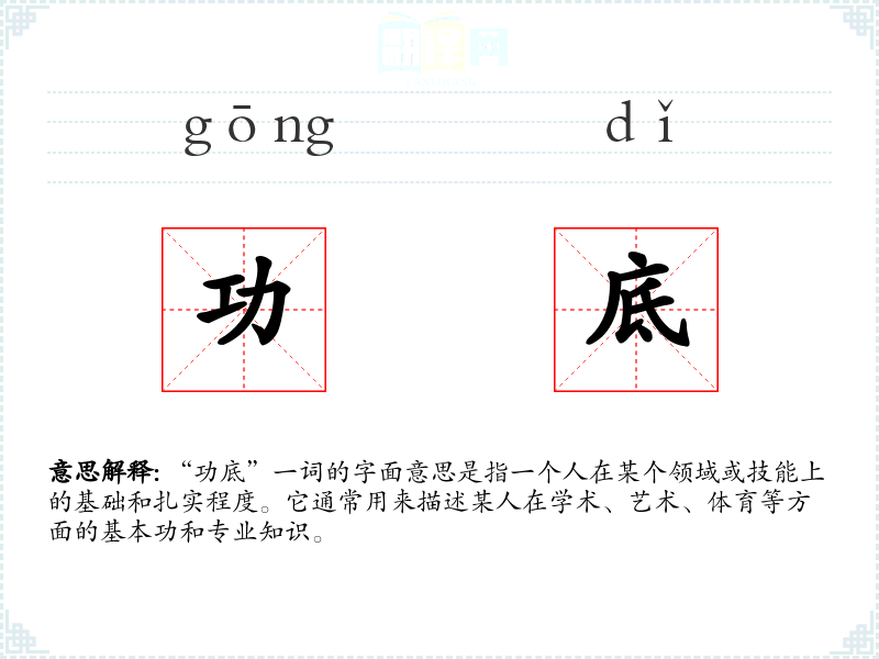 “功底”一词的字面意思是指一个人在某个领域或技能上的基础和扎实程度。它通常用来描述某人在学术、艺术、体育等方面的基本功和专业知识。