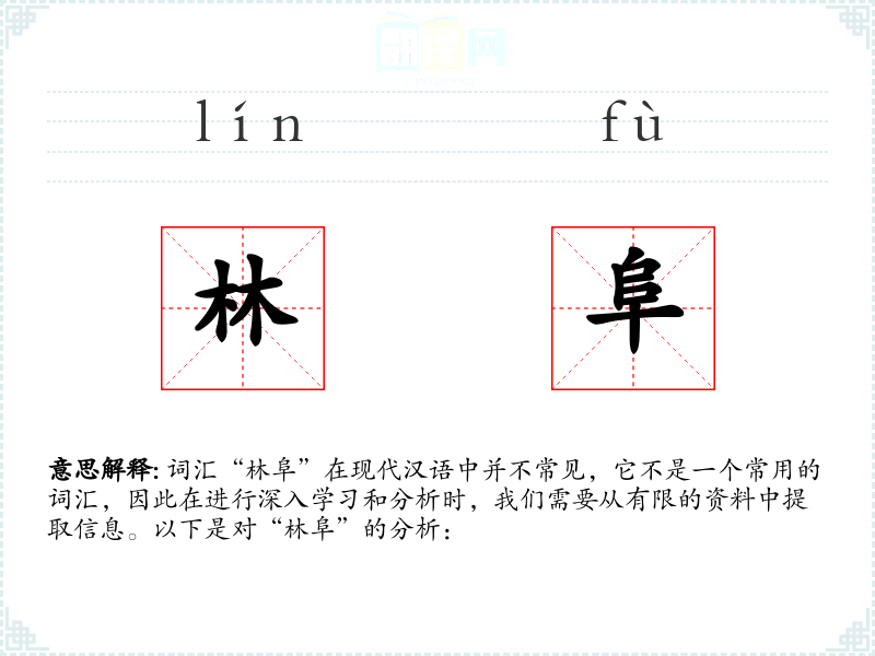 - 反义词:平原、沙漠、湖泊(这些词汇与“林阜”所指的自然景观形成对比)