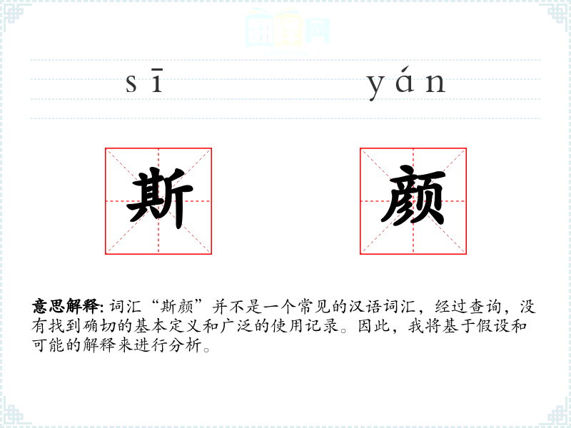 由于“斯颜”不是一个常用词汇,它在不同语境下的使用可能非常有限。如果存在,它可能出现在某些特定的文学作品或方言中,用来形容某人的面容或表情。